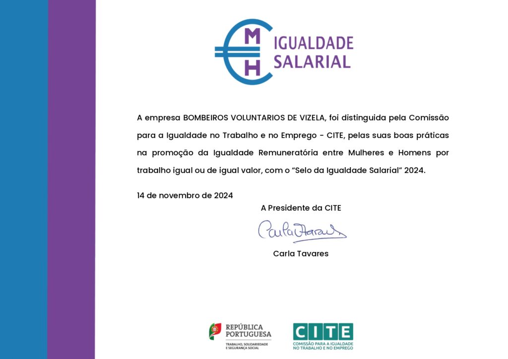 BOMBEIROS VOLUNTÁRIOS DE VIZELA foram distinguidos pela Comissão para a Igualdade no Trabalho e no Emprego – CITE, pelas suas boas práticas na promoção da Igualdade Remuneratória entre Mulheres e Homens por trabalho igual ou de igual valor, com o “Selo da Igualdade Salarial” 2024.